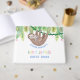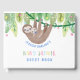 Celebre a minha futura mãe com este lindo livro de hóspedes do bebê chá de preguiça! Com uma adorável e pintada à mão e preguiça-bebê (com uma gravata de arco super fofa) se abraçando na selva. Vinhas cinzentas, flores rosa-doces e amarelas e folhas de selva verde macia decoram o fundo. O fundo tem um padrão de folha verde claro e escuro.