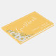 O design do guestbook de casamento personalizado bonito apresenta cores brancas margaridas canto sobre fundo amarelo daffodil com blocos de texto personalizáveis brancos em fontes modernas