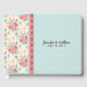 Livro de hóspedes de chic feito em um coral colorido e uma mistura azul de flores, na metade da coluna do livro, e um padrão de bolinhas azul de ovo de robin, na outra metade. Estão disponíveis produtos de casamento lindos e combinados. Personalize o texto marrom para atender às suas necessidades de casamento.