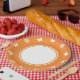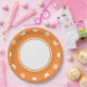 Adicione um toque bonito e coordenado ao seu janto de ensaio, chá de panela, ou até mesmo um casamento de temas primavera mais casuais com estas placas de papel, com uma jante laranja brilhante decorada com margaridas brancas e borboletas e borboletas magras com uma seção central branca. Certifique-se de verificar os outros produtos do conjunto Dísies e Borboletas em Laranja para criar uma busca verdadeiramente coordenada pelo seu evento.