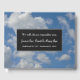 Este manual de funeral/memória minimalista apresenta a mensagem "Sempre nos lembraremos de você", e o nome personalizado e as datas de nascimento/morte do indivíduo que faleceu. Ele também apresenta uma cinza e nuvens brancas e fundo azul do céu. Pode ser usado para registrar condolências à família e aos amigos de alguém que morreu recentemente.