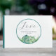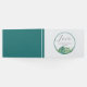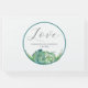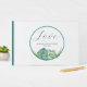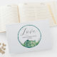 Este livro de hóspedes mostra folhas tropicais de palma aquarela em tons botânicos de verde. A palavra "Amor" é definida na tipografia elegante da escrita. Use os campos de modelo para adicionar seus nomes personalizados e data de casamento. Visite www.zazzle.com/dotellabelle para ver o tema do casamento de destino completo. Arte de aquarela e design por Victoria Grigaliunas do Do Tell A Belle