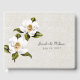 O livro de hóspedes de casamento feito em um olhar de roupa de marfim natural. O bonito trabalho de arte de vintagem de flores brancas de magnólia enfeite o cobrir frontal e traseiro. Personalize os campos de texto em preto para seu dia especial. Os produtos de casamento correspondentes estão disponíveis.