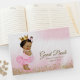 Livro convidado, cor-de-rosa e chá de fraldas-de-ouro, com uma adorável princesa étnica africana-americana vestindo um bonito tutu de bailarina rosa, coroa dourada e uma corda de pérolas num belo fundo rosa e dourado. Você pode personalizar facilmente este bonito livro de convidados de chás de fraldas simplesmente adicionando seu texto. Você também pode remover o fundo rosa e branco e adicionar a cor de fundo de sua escolha.