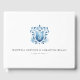 Convide seus convidados de casamento para compartilhar seus desejos e sabedoria com este elegante livro de convidados de casamento com crista de aquarela em tons de azul. Use os campos de modelo para personalizar com suas iniciais, nomes e data de casamento com monogramas. O livro se reverte para uma cor azul poeirenta sólida. Para ver mais designs de casamento, visite www.zazzle.com/dotellabelle
