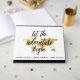 "Deixe a aventura começar" destino casamento Livro convidado com um mapa dourado sobre um fundo de cor editável (mostrado aqui em branco e preto). Sotaque de caligrafia.