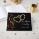 Este livro de hóspedes é mostrado a preto com uma adorável impressão de dois corações com nomes de exemplo personalizados. Personalize este livro e altere o texto para o seu.