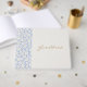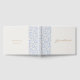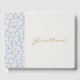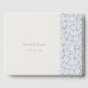 Chic e fresco com charme juvenil. Este livro de convidados do casal encanta-se com um conjunto de fontes modernas e modernas, nomes de casais no verso, um quadro azul e branco floral contra um fundo branco/bege.