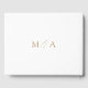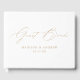 Livro de convidados elegante com "Guest Book", exibido em um roteiro de caligrafia em ouro moderno, em um fundo branco. Personalize a frente do simples livro de convidados do casamento com seus nomes e data do casamento. A parte de trás do livro de hóspedes mostra as suas iniciais do monograma. Adicione seu nome casado e data de casamento à espinha do livro de hóspedes.