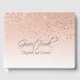 Um lindo livro de convidados de casamento feito em um fundo obscuro, com gráficos de um rosa dourado que parecem brilhar. O texto gráfico rosa dourado diz Guest Book (Livro Convidado). Personalize os nomes da noiva e do noivo, para o seu dia especial.