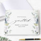 Livro de convidados elegante (ou qualquer outro evento) com elegante cor d'água verde e detalhes florais brancos azuis e elementos caligráficos modernos escritos à mão. Parte da nossa coleção "Elegante Bliss" com uma variedade de produtos de coordenação disponíveis, incluindo o sinal "assine nosso guia".