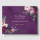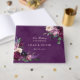Flores românticas em tons de robusto rico, lilás suave, berinjela profundo, coroa roxa e rosada com botânicos verdes modernos, como samambaias e eucalipto. Um fundo profundo, berinjela, cor d'água roxa, gravatas tudo junto com a elegante tipografia neste romântico livro de convidados de casamento. dentro de páginas de vazio para os convidados assinarem.