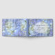 A hidrangea azul-clara floresce o livro de hóspedes com linhas dentro e o texto na frente. Na linha de design da "Lua Azul", adicione nomes da noiva e do noivo, juntamente com a data do casamento. As flores azuis pálidas bonito são pintadas com amarelo e branco.