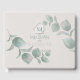 Livro de Convidados de Casamento | Silver Sage Eucalyptus Monograma Casamento Geométrico Botânico - Folhas de eucalipto transparente em dólar de prata com cor aquosa, em verde-salva, com uma caixa de prata geométrica moderna em decor, a um ângulo de 45 graus, com um prato branco quadrado para o quadro do monograma - - todas colocadas sobre um fundo bege latte quente. Outra design de noiva criada por © WhimsicalArtwork™ Uma abordagem lúdica da tipografia no texto - com as iniciais de nome próprio Bride e Groom cercadas por um quadrado geométrico em duas cores (sábio e prata) - seguida de coordenação de fontes modernas.