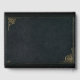 A design vem de um cobrir de livros pretos de couro, antigos, com embelezamentos de ouro no canto.