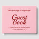 Este manual de eventos simples apresenta as mensagens "Livro de Convidados" e "A sua mensagem é solicitada!", juntamente com um nome de evento de data/ocasião personalizado. O texto tem cor vermelha escura e o fundo é cor-de-rosa. Um livro de hóspedes genérico e personalizável como este poderia ser usado em um evento como uma reunião familiar, uma festa de aniversário, uma comemoração de aniversário de casamento, um casamento, ou algum outro evento com hóspedes que talvez queiram deixar uma mensagem.