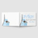 Livro de convidados do chá de fraldas de Paris com um bebê americano de etnia africana bonitinho em presentes azuis e prateados e formação da Torre Eiffel. Você pode adicionar o texto de sua escolha à frente e à coluna para personalizar este adorável livro de convidados do chá de fraldas Paris.