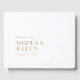 Este livro de hóspedes de deco de arte moderna minimalista apresenta um belo, preto, formal, e um design casual e simples para uma celebração tradicional ou mais rústica de casamento. O layout simples, neutro de ouro e branco com tipografia clássica e única alude ao mínimo de fazer ou retrorreflector clássico, que é perfeito para qualquer tema de evento.