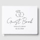 Este livro de hóspedes personalizado apresenta caligrafia e um gráfico de anéis de casamento de diamante, juntamente com nomes de noivas e noivos e data de casamento no fundo. Você também pode adicionar as iniciais da noiva e do grupo ao lado traseiro, remover ou alterar o texto de sua escolha.