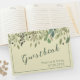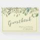 O design do livro de convidados moderno apresenta aquarela eucalipto deixa borda no fundo do creme com blocos de texto personalizáveis em fontes modernas