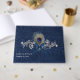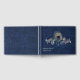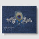 Chic Blue no casamento tema damasco azul no livro. Gráficos de prata e pérola rico florescem, na frente do livro de hóspedes, tem uma pena de pavão e um arco de cetim azul decorando o meio. Personalize o texto para seu dia especial.