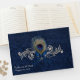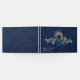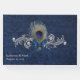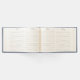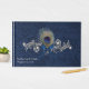 Chic Blue no casamento tema damasco azul no livro. Gráficos de prata e pérola rico florescem, na frente do livro de hóspedes, tem uma pena de pavão e um arco de cetim azul decorando o meio. Personalize o texto para seu dia especial.