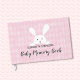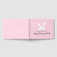 Bonita rosa, em forma de diamante, fundo que celebra uma menina. Um coelho branco aparece logo acima de um modelo e um script do "Livro de Memória do Bebê". Este é um pequeno livro especial para guardar todas as memórias de um novo bebê!