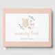 "Uma doce menina está a caminho" Comemore a futura mãe com este livro de memória de chá de fraldas rosa e verde pastel com ilustração de um "baby-romper", calçados, um arco e um brinquedo de bebê de madeira giro cercado de verde eucalipto.