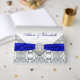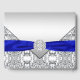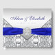 Elegante livro de presentes azul royal e prata com fita azul royal diamante em um belo fundo de renda prateada. Este lindo livro de presentes de casamento azul royal é facilmente personalizado para o seu evento, basta adicionar seus detalhes no estilo de letra de sua escolha.
