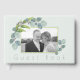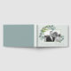 Livro de registro de casamento com modelo de foto. Cor azul-esverdeada pálida bonita com ramos de eucalipto aquarela que enquadram a foto. O texto “Livro de registro” é estilo de fonte fina e impressa. Perfeito para casamentos com tema natural. As cores são folhas cinza-azuladas e ramos verdes. Linhas finas enquadram a foto. A parte de trás do livro é um azul mais escuro.