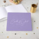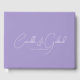 Esta caligrafia de guião branco fluindo no livro de hóspedes de lavanda é perfeita para um casamento moderno. Design minimalista simples.