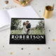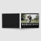 Este livro de fotos contém sua foto favorita na frente. Seu sobrenome é apresentado em uma fonte branca de todos os bonés com seus nomes e data de casamento também em branco. O fundo é preto na frente e atrás. "O casamento de (noiva e nome do noivo) e a data estão listados na coluna. O texto pode ser personalizado para ajustado das suas necessidades.