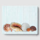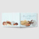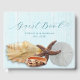 Livro de hóspedes com tema de praia e design de conchas. A madeira azul-clara é o pano de fundo do seu texto, que pode incluir nomes da noiva, noiva e data do casamento. Os conchas realísticos decoram a frente e o dorso e incluem estrelas-do-mar (estrela do mar), dólares de areia, conchas e alcaças. Este livro de hóspedes é perfeito para uma praia, um casamento tropical ou de verão, ou tema.
