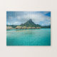 Quebra-cabeça de serra de vaivém de um recurso luxuoso do bungalow do telhado thatched do overwater em um recurso de férias na lagoa azul clara com uma vista na ilha tropical de Bora Bora, perto de Tahiti, em Polinésia francesa.