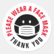 Por favor, vista um sinal de máscara de rosto adesivos de lembrete de Distância Social. Coloque os adesivos Round Corona Virus Covid19 com modelo de ícone e texto. Crie autocolantes personalizados e selos de envelopes para a pandemia de saúde do código 19. Cores e texto personalizáveis para informar o público sobre os revestimentos faciais, regras de higiene, mãos de lavagem, distância, etc. Adicione seu próprio slogan personalizado ou mensagem de aviso. Este design pode ser transferido para qualquer outro produto do Zazzle.