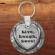 Essas famosas três palavras: "Live, Laugh, Love", em texto negro e negrito em um suave coração de 3d impresso em prata, que está em uma cintura brilhante e reluzente, parecem fundo. Um excelente inspirador dizendo para viver. Bom para casamentos, 25 de prata, dia de os namorados, festas de aniversário de ano novo, etc. Uma encrenca de chaves encantadora, divertida e única para si mesmo ou como presente para aquela pessoa especial.