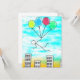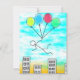 Personagem de desenho animado usando balões para voar sobre a cidade. Imagem digital.