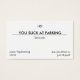 Ei... Você é péssimo no estacionamento. Cartão de visita. Perfeito por colocar sob a lâmina de alguém. Esta versão tem menos profanação e é menos ameaçadora do que o nosso cartão clássico. Na próxima vez que você vir alguém estacionado como um buraco-A, não seria legal ter uma dessas cartas para deixá-los saber como você se sente?