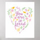 Você é tão amada que as meninas poster apresentam tipografia moderna escrita à mão e flores com cupcakes, pássaros e setas. Excelente para um quarto para crianças e se encaixa em um esquema decorativo rosa, roxo e amarelo.