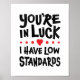 Uma linha de recolha astuta ou um insulto suave - depende de você! Você está com sorte que eu tenho padrões baixos é uma citação de namorando sarcástica que pode ter uma variedade de significados diferentes.