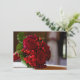 As características deste design uma foto de um buquê da rosa vermelha e da baga com suas hastes envolveram na fita vermelha. O buquê descansa em uma mesa, e você pode ver uma imagem macia de uma noiva no fundo. Este cartão é perfeito para pedir que seu amigo seja uma dama de honra, um florista ou uma madrinha de casamento. Personalize este cartão bonito com sua própria mensagem.