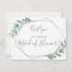 Essa carta super fofa é a maneira perfeita de perguntar "você será minha madrinha de casamento?" O design apresenta uma moldura geométrica de folha prateada cônica com texto tipográfico de tendência e cor d'água exuberante eucalipto verde. Estas cartas são fáceis de personalizar e podem ser usadas para pedir aos seus entes queridos que sejam a sua dama de honra, empregada ou dama de honra, florista, etc.