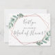 Essa carta super fofa é a maneira perfeita de perguntar "você será minha madrinha de casamento?" O design apresenta uma estrutura geométrica de folha de rosa de ouro cônica com texto tipográfico de tendências e cor d'água exuberante eucalipto verde. Estas cartas são fáceis de personalizar e podem ser usadas para pedir aos seus entes queridos que sejam a sua dama de honra, empregada ou dama de honra, florista, etc.