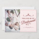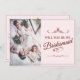 Você será minha dama de honra? Três madrinhas mentirosas com buquês em vestidos cor-de-rosa macio em frente a uma janela. O Backtext pode ser ajustado no modelo. Foto de Valerie Elash