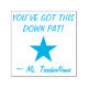 Este inspirador design de carimbo apresenta a mensagem "VOCÊ TEM ESTE PAT BAIXO!" e o nome de um professor ou educador personalizado. Ele também apresenta uma forma decorativa de estrela. Ele poderia ser usado por um professor de escola, educador ou orientador ao formando o trabalho estudantil, para reconhecer que um aluno fez um trabalho excepcional.