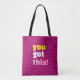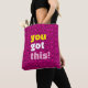 Esta na moda e inspiradora bolsa de tote apresenta um fundo fuchsia vibrante com um design espiral preto que chama a atenção que adiciona uma sensação de energia dinâmica. Uma mensagem colorida, ao estilo pop, em letras ousadas e brincalhonas, diz: "Você tem isso!", oferecendo uma dose diária de motivação para onde quer que vá. Perfeito para adicionar um "pop" de cor às suas tarefas diárias, este bolsa é excelente para carregandos, compras ou essências por um dia. A design divertida faz dela um acessório ideal para quem ama cores vibrantes e vibrações.