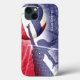 O caso difícil do iPhone de vôlei da GIrl com o tema da cor de uma bandeira americana mostra jogadora de vôlei na rede chegando para um vôlei vermelho, branco e azul - o composto de gráficos esportivos inclui uma mistura de vários gráficos de vôlei e sotaque com um gradiente de cor vermelho, branco e azul - seu nome é personalizável - por katz_d_zynes