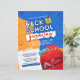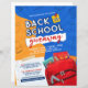 Uma diversão de volta ao suprimento escolar e o folheto de mochila apresenta um script 3D, fundo azul e laranja com material escolar e uma mochila vermelha.