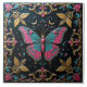 Um azulejo cerâmico vintage com borboleta rosa e ciano e ornamentos de ouro em fundo preto