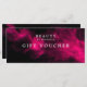 Este design de vale-presente moderno adiciona um toque de entusiasmo e sofisticação às opções de oferta da sua empresa. Com a vibrante fumaça cor-de-rosa neon girando graciosamente contra um fundo preto elegante, este vale não é apenas um pedaço de papel, é uma promessa de experiências memoráveis. O texto branco simples, mas elegante, garante que os detalhes sejam claros e facilmente legíveis. Quer você queira oferecer aos seus clientes um presente ou recompensa exclusivos, este design de comprovante faz uma declaração que diferencia sua empresa. É um convite para um mundo de momentos especiais e diversão, permitindo que seus clientes explorem o que seus negócios têm a oferecer. Compartilhe a alegria com nosso vale-presente moderno e eleve sua experiência de doação.